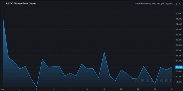 En termes de volumes d’échange, l’USDC s’est taillé la part du lion avec environ 353 milliards de dollars de transactions, soit 41 % du volume total. En août, le stablecoin était impliqué dans 1,8 million de transactions, soit une augmentation d’environ 6 % par rapport aux 1,7 million enregistrés en juillet.