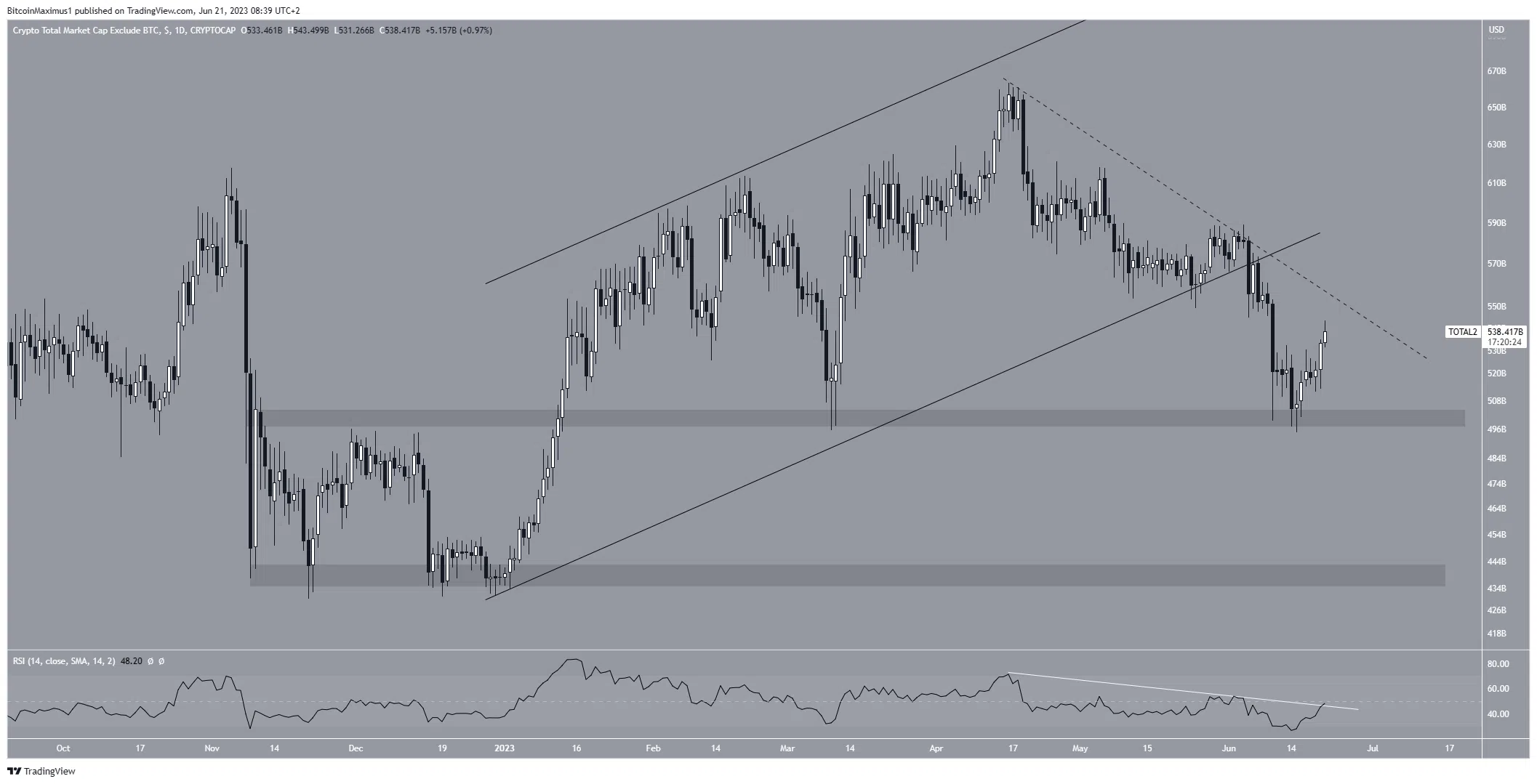 En conséquence, il est fort probable que l’ALTCAP perde son support de 500 milliards de dollars et se dirige vers son support de 440 milliards de dollars.