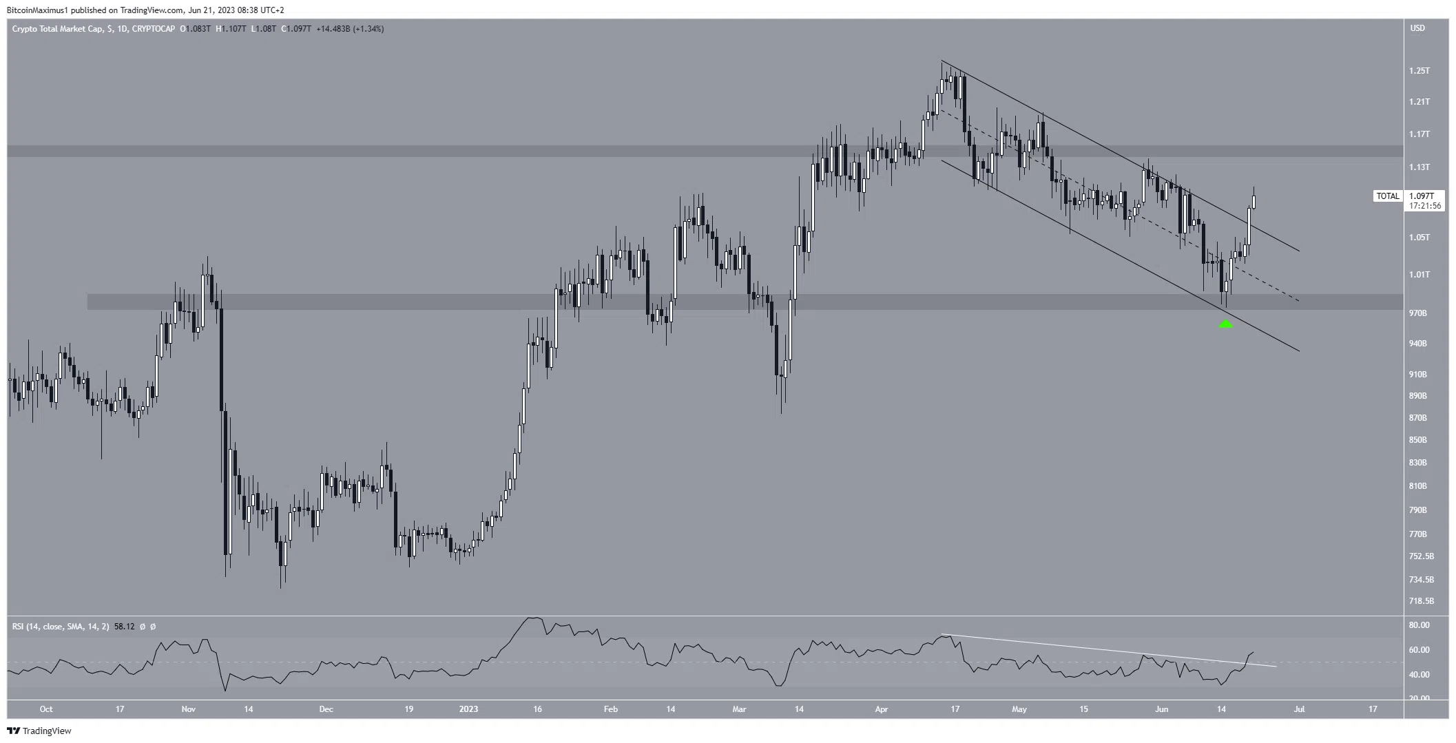 Le 15 juin, la TOTALCAP a rebondi vers la zone de support de 980 milliards de dollars, avant d’entamer un mouvement ascendant vers la ligne de résistance du canal.
