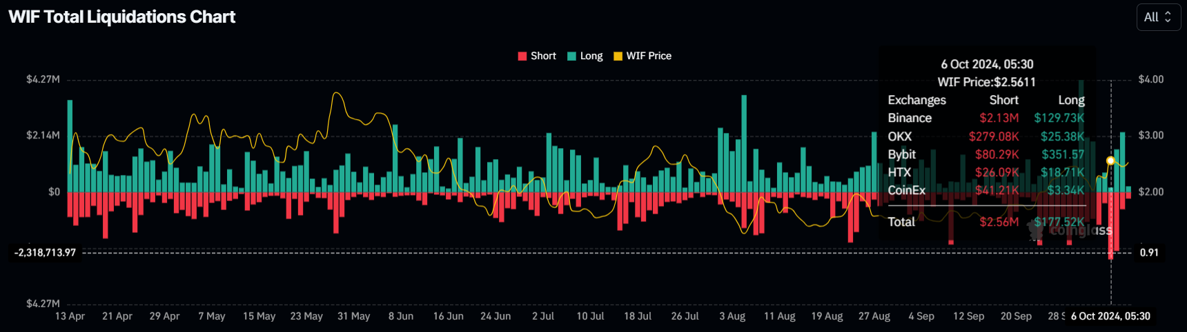 Le Momentum macroéconomique derrière le WIF s’est renforcé avec les données de liquidation, qui montrent que les liquidations de positions courtes ont atteint un sommet sur six mois.