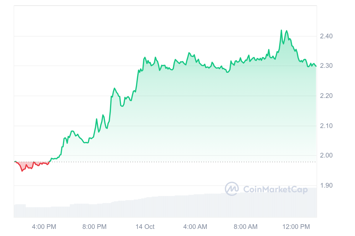 A l’image de bon nombre de cryptomonnaies, le cours du Worldcoin a eu du mal en ce début de mois d’octobre. Cependant, après quelques jours de flottements, il vient de se remettre sur le droit chemin. Sur une base journalière, il vient de repasser au-dessus des 2 $, avec un prix d’échange qui est maintenant de 2,30 $. Au meilleur d’une journée qui aura vu le WLD gagner 15,99 %, il aura même réussi à dépasser temporairement les 2,40 $.