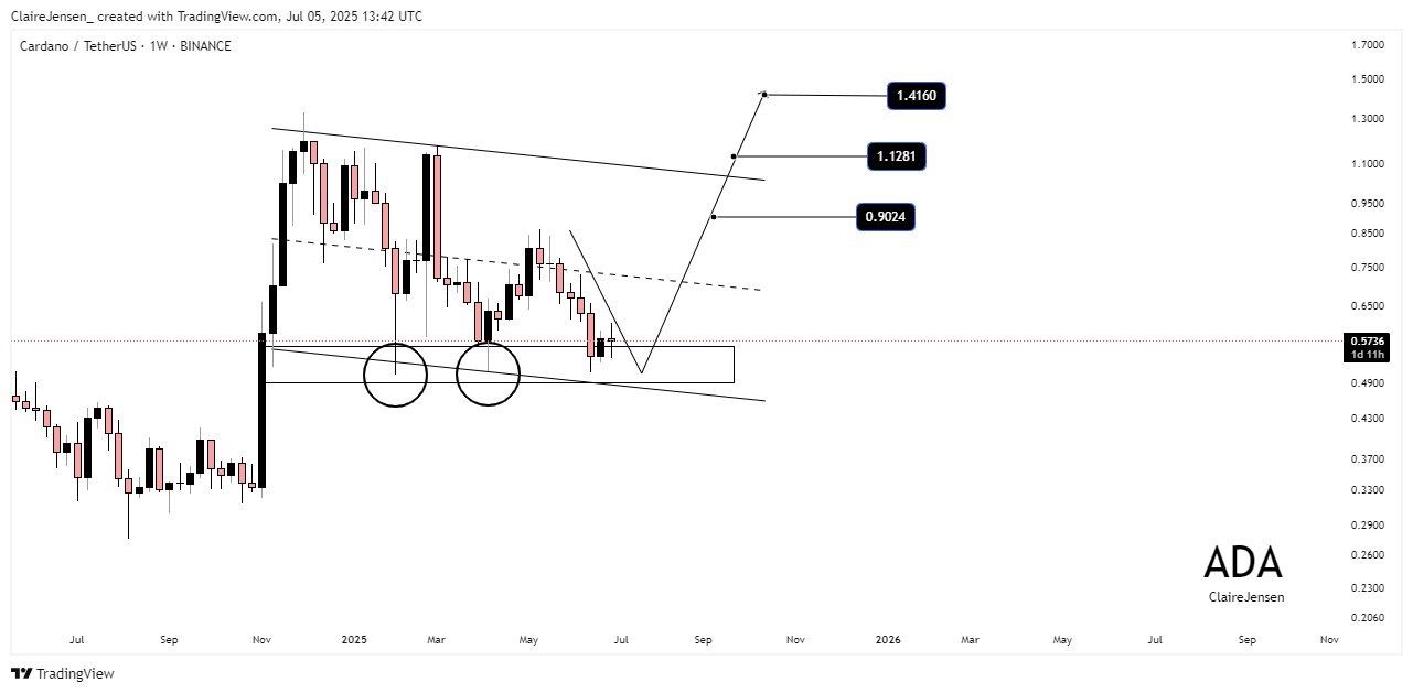 Quant à ADA, l’analyste @LLuciano_BTC confirme la cassure d’une ligne de tendance descendante, souvent synonyme de retournement majeur. Claire Jensen ajoute que le prix évolue sur une zone de support clé, testée plusieurs fois. Si ce niveau tient, ADA pourrait viser 0,90 $, puis 1,12 $ et potentiellement 1,41 $ dans les semaines à venir.
