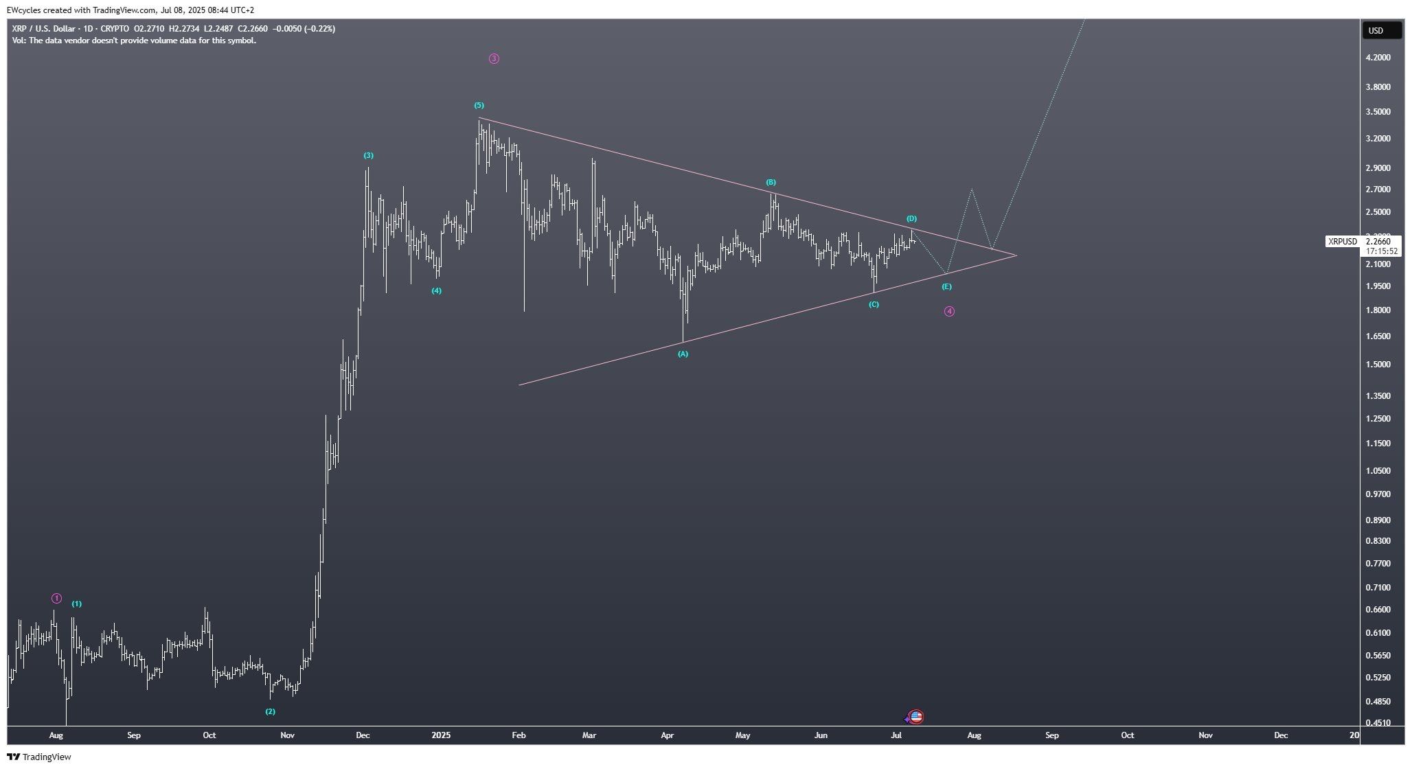 Même son de cloche du côté de l’analyste EWT, qui identifie une compression en triangle symétrique sur le graphique, annonçant un mouvement explosif imminent.