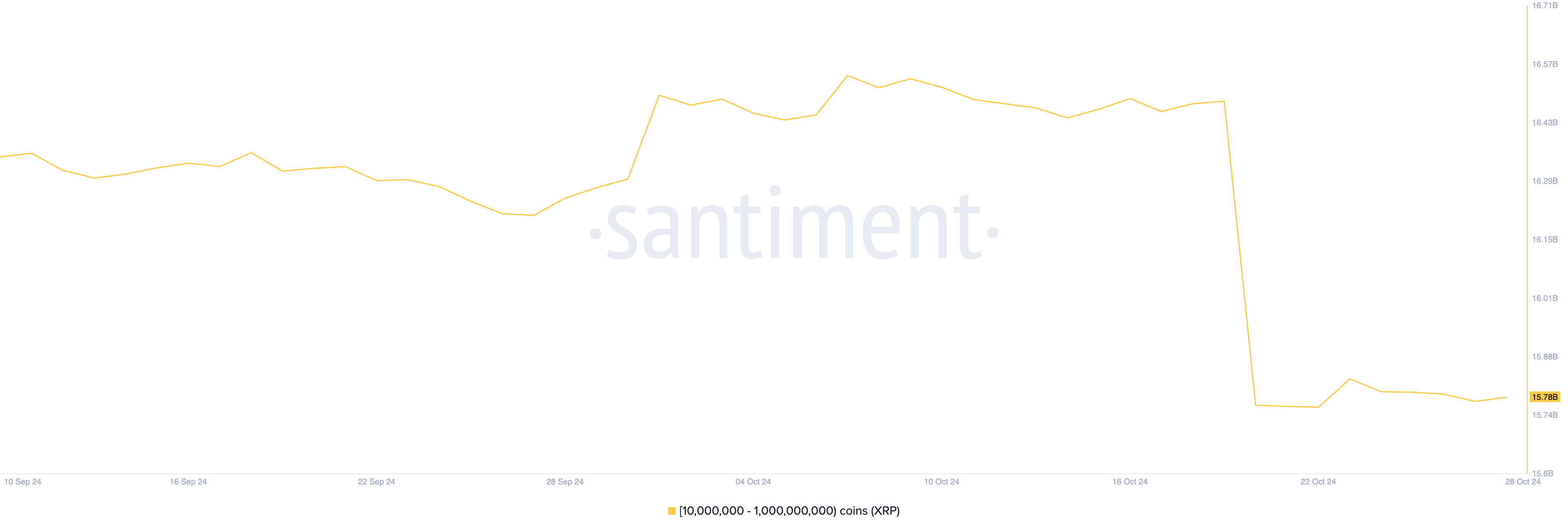 La performance peu convaincante du cours du XRP ces dernières semaines a poussé ses baleines à distribuer certains de leurs tokens. Les données de Santiment révèlent ainsi que les grands investisseurs détenant entre 10 000 000 et 1 000 000 000 de XRP ont vendu 700 millions de leus pièces, évaluées à 357 millions de dollars aux cours actuels du marché, depuis le 19 octobre. Ce groupe possède maintenant 15,78 milliards de pièces, marquant sa plus faible détention de XRP depuis début le mois d’août.