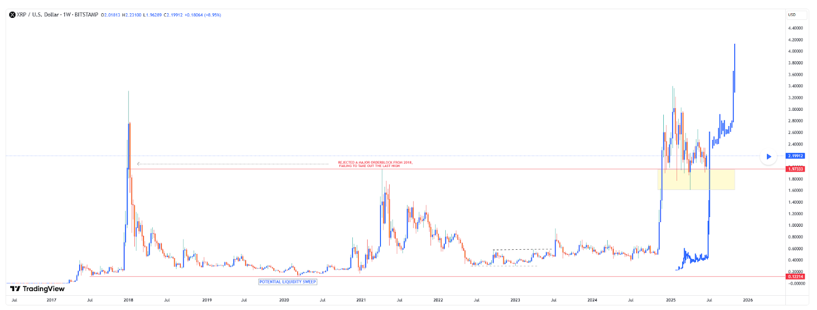 Selon l’analyste BA_Investments, un signal d’achat important s’est formé. Suite au dépassement du canal entre 0,12 et 1,97 $, zone qui le bloquait depuis 2018, le XRP se maintient au-dessus des 2 $ et y a rebondi deux fois.