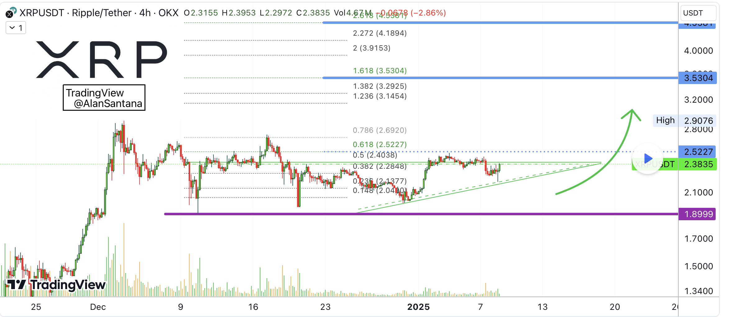 L’analyse technique du XRP révèle plusieurs signaux encourageants malgré la correction actuelle. Selon l’expert ZAYK Charts, le XRP évolue à l’intérieur d’un pennant haussier clairement visible sur le graphique en 8 heures. Cette figure, souvent considérée comme une configuration de continuation haussière, indique une consolidation avant une possible rupture à la hausse. Si le prix parvient à casser cette figure, un objectif ambitieux de 3,5 $ pourrait être atteint à court terme.