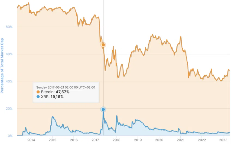 Le 21 mars 2017, l’espace d’un instant, le XRP a atteint sa dominance la plus élevée sur l’ensemble du marché crypto. Cette valeur a été figée à 19 % alors que celle de Bitcoin était de 47 %. Cela signifie que 19 % des fonds engagés en crypto-monnaies étaient destinés au jeton de Ripple.